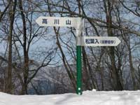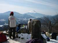 30センチほど積もった雪道をザクッザクッと気持ちよく足を運ぶ事も雪山の楽しみの一つだ急な登山道は殆ど無くジグザグに登り易く登山道が出来ているので非常に助かる。古宿から歩き始めて約2時間稜線に出る。此処から高川山山頂まで10分ほどボブスレーのコースの様に登山道が踏み固められていてスリップに注意しながら行く。10:14急に視界が開けて標高975mの高川山山頂に到着する。