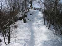 積雪の在る登山道は気持ちよく歩けるが日当たりの良い所では雪が解けてぬかる道となっているので雪道以上に注意して下る。高川山は全体的に歩きやすい登山道だった。
