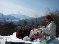 山頂には10人ほど登山者が来ていて素晴らしい富士山の眺めをカメラに収めたりして楽しんでいる。我々も一段下がった所で富士山を眺めながら昼食と食後のコーヒーで大満足出来る。