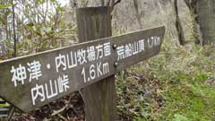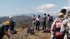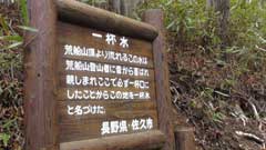 途中の木々の合間から北アルプスの山並みの展望があり、白馬三山、鹿島槍、穂高など確認できる。一杯水の沢を渡り岩の斜面の急な登りとなり、一気に高度を上げて荒船山の山頂の一端に出る。