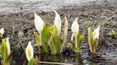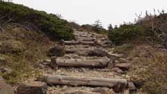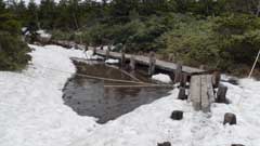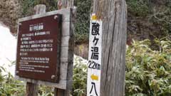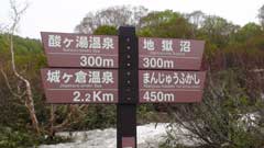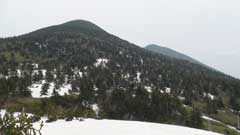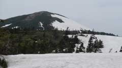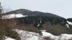 ロープウエイを利用して八甲田山(大岳)迄登る計画でいたのだが生憎今週1週間は機械の整備でロープウエイは運休のため酸ヶ湯温泉登山口から無理をせず登れる所まで行く事にする。酸ヶ湯温泉の際にある登山口は毛無岱へ行く登山口で千人岱経由大岳登山口は酸ヶ湯温泉前の広場から一段上の広い駐車場の道路を渡った所にあり、目的地を確認して残雪の多い登山道を登って行く。