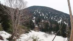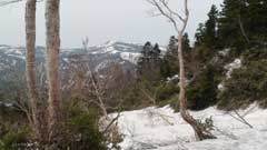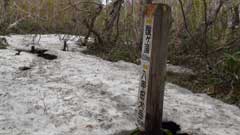 登山道は残雪で覆われていて標識と踏み後を頼りに登ってゆく。所々で雪が無くなるが大半は雪の上を登ってゆく。笹薮や倒木などがあり意外と歩きにくい雪道の登りが続く。