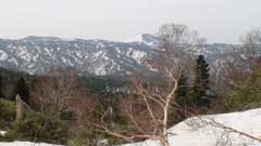 1時間ほど登ると地獄湯ノ沢が右下に見えてくる。振り向けば南八甲田山の山並みが残雪で白く輝いて見える。景色も良いので尾根筋の雪が無い所で休憩する。お昼には早いが酸ヶ湯温泉の売店で買ってきたおにぎりを食べて見ると歯ごたえの良いお米で非常においしくて大満足。