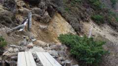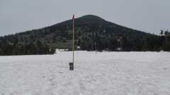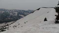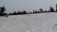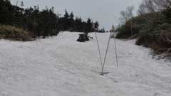 避難小屋付近も残雪が多く深い所は2mほどの積雪があり、北側の斜面は充分山スキーが出来る状態だ。目前の大岳を見ながら引き返すのは少々残念な気もするが今回は下見と言うことで、此処までにして天候が悪くならない内に引き返すことにする。