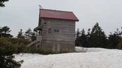 天気は下り坂のようで青空は消えて行くが雨の心配は無さそうだ。登山道が残雪で見えないので何処が避難小屋の分岐かわからず、千人岱の中心付近より小岳方面に足跡を頼りに100mほど行くと避難小屋がある。