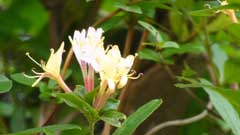 経ヶ岳林道を半原乗越まで戻る途中山の斜面から垂れ下がるようにスイカズラの花が多く見られる。白い花とクリーム色の花に混ざってピンク色の花も見られる。経ヶ岳林道をゆっくり花を眺めながら行く。この時期一番多く見られる花はウツギで山の斜面の至る所で小さな白い花を密集させて咲いている。 経ヶ岳林道を歩いている内、ガスが懸かっているが影がハッキリ写るぐらい陽射しが強くなり汗ばんでくる。経ヶ岳林道には蝶も多く見られて、忙しそうに花の蜜を吸いながら花から花へと飛び交って行く。常に羽を動かしていて警戒心もあるので近づけず写真チャンスは難しい。