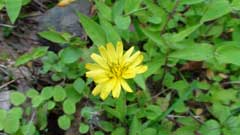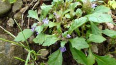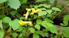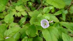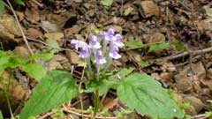 山頂を出発する直前に地元の人一人がトレーニングの為ペットボトル1本のみ持って登って来て直ぐに戻って行く。体調も回復したので経ヶ岳林道を回って戻るコースで下山開始(13:00)休憩ベンチを2箇所通過して防護柵を通過、暫く行くと左上部にジャケツイバラの黄色の花が目に付く。少し斜面を登り地被いてカメラに収めてくる。 青木の群生する急斜面をジグザグに降ると経ヶ岳林道に出る。(13:26)林道の所々で紫色の小さな花をつけたコバノタツナミソウが多く見られる。