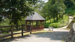 ブロックの敷き詰められた遊歩道(桜並木)を5分ほど登ると休憩舎があり、ドライブの休憩を兼ね息抜きに津久井湖の展望が得られる。