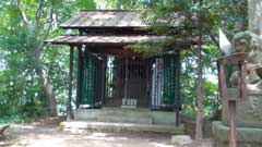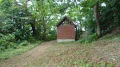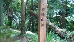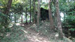 再び緩やかな登山道を登って行くと宝ヶ池のある分岐点に出る。目前の小高い所に飯縄曲輪跡に飯縄神社の小さな社が建っている。右手から周りスギの大木を見てから城山山頂(本城曲輪)からの尾根路に出て石階段を登った所に飯縄神社がある。