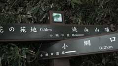 此処(鷹射場)から西側に降る登山道があるので城山周遊路に下れると思い暫く降って見たが方向が反対なので引き返す。跡で解った事だがこの路は小倉橋方面に下る道だった。再び飯縄神社のピークを過ぎて降ると十字路の鞍部で、左パークセンター(根小屋)右周遊路経由小網登山口の標識がある。直進して城山山頂に向かう。