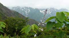 雲の多い天気だが時折白馬三山の頂が見えるが直ぐに雲に隠れてしまう。幸い直射日光を受けずに歩けるが一時雨が降ってきて雨具を着用したが直ぐに止んでしまう。夏休みの学校行事で来ている生徒が多く賑やかな八方尾根となっている。