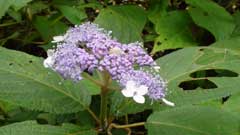 連日の雨もあがり青空が広がる天気となったので高取山から仏果山を回るコースを歩いて来る。出発は午後となったが夕方の雷雨も無く静かで涼しい山歩きが出来る。県道宮が瀬線の橋脚の下(仏果山登山口A)に車を停めてゲートを抜けて林道を登る。林道の両際にはアカソ、タマアジサイ、ヤブマオが多く見られる。直ぐに高取山登山路の標識があり(P0)右手の沢を渡り山の中に入って行くがヤブが多く歩きにくいので林道を直進する。