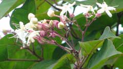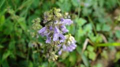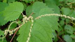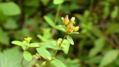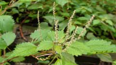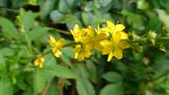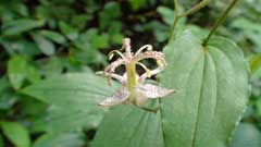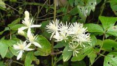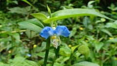 舗装された急斜面の林道は表面が雨で滑りやすく注意しながら登る。ミズシキ、キンミズシキ、イラクサなどを両サイドに見ながらゆっくり登る。立ち止まり足元を良く見ると小さな花、ゲンノショウコ、ヤマトウバナ、ヤマホトトギスなども咲いているが小さいので良く見ないと通り過ぎてしまう。ツユクサもまだ多く見られる。黒い大きな蝶が忙しそうに飛び回っているが花に止まらないので撮影は出来ず。T字路付近(P1)からはセンニンソウの広い花が満開で昆虫が蜜を吸いに来ているヒヨドリバナも多く見られるが一部咲き程度でこれからが見頃と成るようだ。