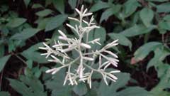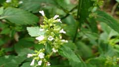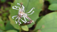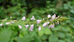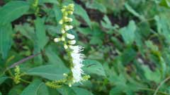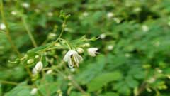 馬場・大平合流点からは尾根筋を離れて尾根の斜面を緩やかに行くと直ぐに右手に下る登山道を見送り(余り利用されていない)ゲートを潜り抜けるとヒノキの植林帯の薄暗い中赤土が露出した滑りやすい登山道を登る。尾根筋に出て鹿避けの柵に沿って僅かに上ると植林帯が終わり巻き路と高取山の分岐点(P4)に出る。以前は明るく多くの花が見られる所だったが今回は雑草が大きく伸びて広がっている。以前は直線に急斜面を登っていてスリップしながら登っていたが斜面を巻く様に登山道も整備されているので登り易くなった。マツカゼソウの小さな花が斜面に多く見られる。