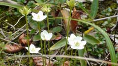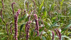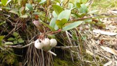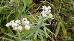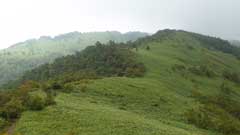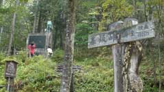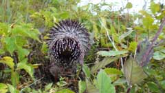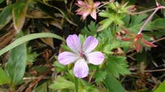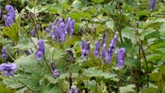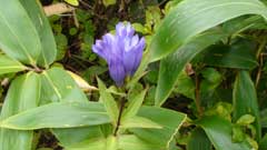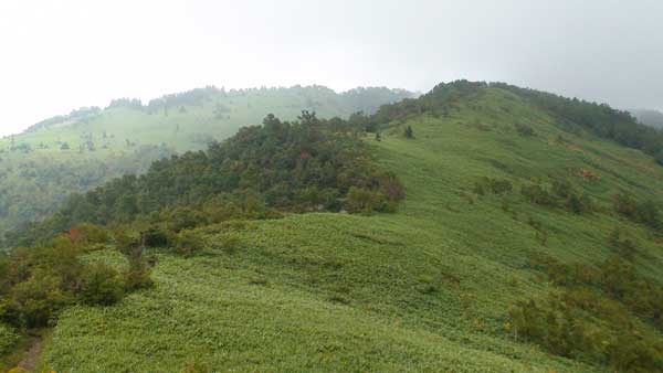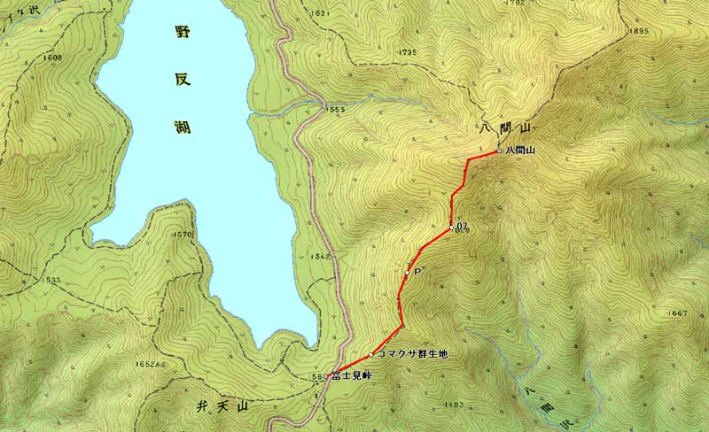 登山道の両際にはエゾリンドウ、ウメバチソウ、マツムシソウが多く見られる。登山道は背丈の低い熊笹が主で視界が良く高山植物も多く見られるので楽しい登山が出来る。見晴らしの良いガレ場で果物とお菓子で軽い昼食と眼下の野反湖を眺めたりゆっくり休憩。充分に八間山の自然の中に浸れたので山頂まで行かず引き返す。