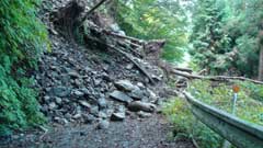 2004年の3月に神戸岩手前の崩落で林道を大タワ(峠)まで歩き峠から御前山に登った事があり、今回は奥多摩側から鋸山林道を利用して大タワ(峠)を目指したが峠の手前約2K地点(地図P0)で崩落による通行止め。車を置いて歩いて崩落箇所(地図P1)を通過して大タワ峠の約400M手前で(地図P2)再び崩落があり。