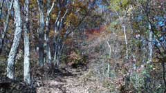 しばし心を和まされる。山頂も近くなり右手の樹林越しに扇山が大きく見えてくると登山道が西方向に向きを変えて急斜面の登りとなる。