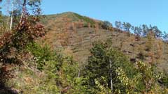 撮影休憩。更に降ると植林帯に入りどんどん降る。途中植林作業用の枝道に入って見ると見晴らしの良い所に出て再び富士山を間近に見られ後方には百蔵山山頂あたりも眺められる。