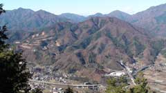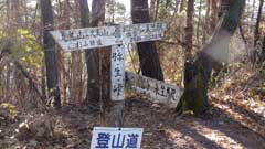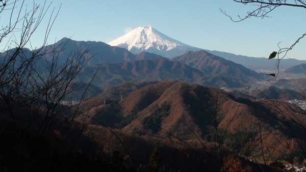 林道を僅かに戻り愛宕神社の際から登山道に入る。昨日の風で登山道はぬれた落ち葉が重なっていて冷たい感じがする。気温も1度程度で日陰の登山道は寒いが登り始めると次第に体も温かくなり順調に歩ける。30分ほど登ると明るい尾根筋(九鬼山から池の山に続く尾根)に出て富士山が良く見える。尾根筋を右に折れて九鬼山に向うと急な登りが暫く続く。途中、天狗岩の展望台(尾根筋から2分ほどの所)に寄って富士山を眺めてくる。更に登り詰めると富士見台で展望が開けて鹿留山の後方に大きな富士山が望める。