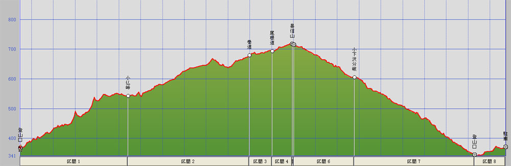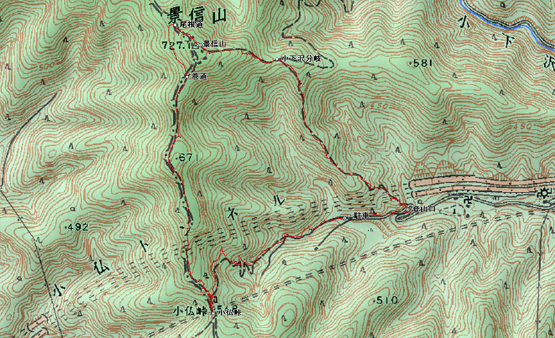 相模原8:10⇒高尾8:40⇒小仏峠登山口9:00→小仏峠9:30→巻道10:00→景信山10:10〜10:45→小下沢分岐10:50→景信山登山口11:18→小仏峠登山口11:22⇒相模原12:30
