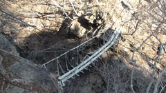 十二ヶ岳の岩壁をロープに捕まりながら50mほど降ると隣の岩壁に渡るアルミ製の吊橋があり慎重に渡る。此処まで来たら引き返すわけにはいかないので吊橋を渡った所で息を整えてから隣の岩山(十一ヶ岳)をロープに捕まりながら岩壁を登る。