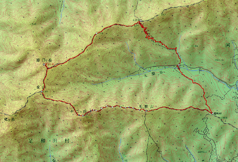 相模原6:30⇒相模湖IC7:20⇒河口湖IC8:00⇒大石峠登山口8:50→大石峠10:05〜10:25→金堀山10:50→節刀ヶ岳11:25〜11:45→金山12:00→十二ヶ岳12:42→毛無山14:00→淵坂峠14:45→大石峠登山口15:15⇒河口湖IC15:50⇒相模湖IC⇒相模原17:30