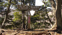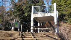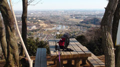 露岩の急斜面を僅かに登ると展望台のある白山山頂、標高283mに出る。関東平野の展望が良く遠く横浜のランドマークタワーや新宿の高層ビル群が眺められる。反対の丹沢方面は冬枯れの木や枝で遮られていて眺めにくい。山頂の北側一角が男坂からの登山道があり巡礼峠へと降って行く十字路になっている。