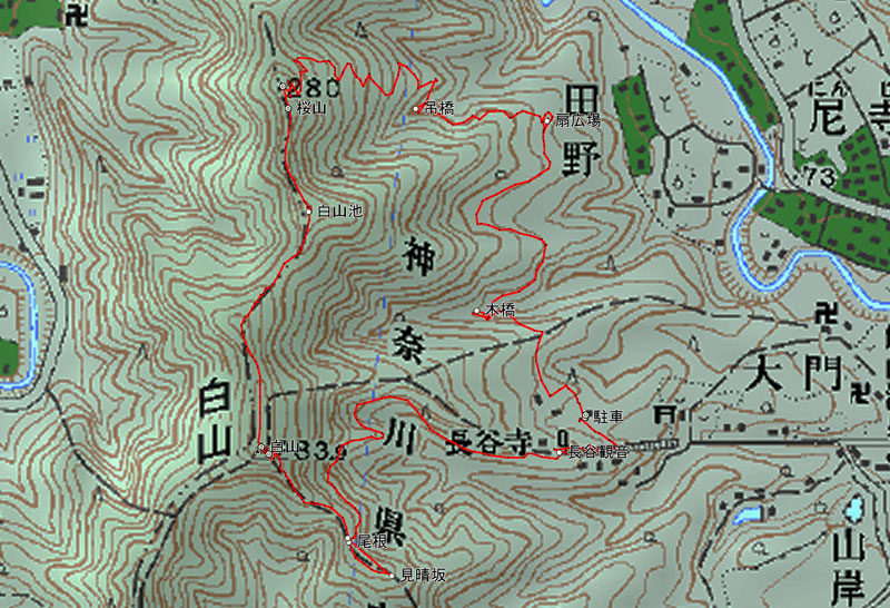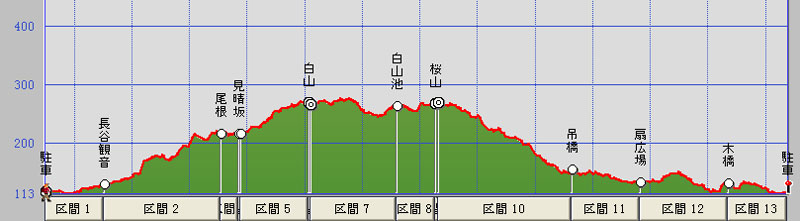 コース 飯山観音(駐車場)11:40→飯山観音11:45→尾根12:00→白山12:25→白山の池12:37→桜山12:45〜13:20→吊橋13:35→扇広場13:46→木橋13:56→駐車場14:00
