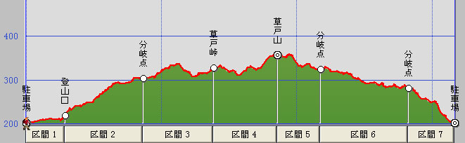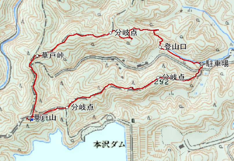 大地沢駐車場→登山口→尾根分岐点→草戸峠→草戸山→青少年の家分岐→大地沢駐車場