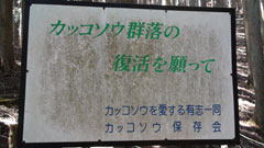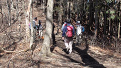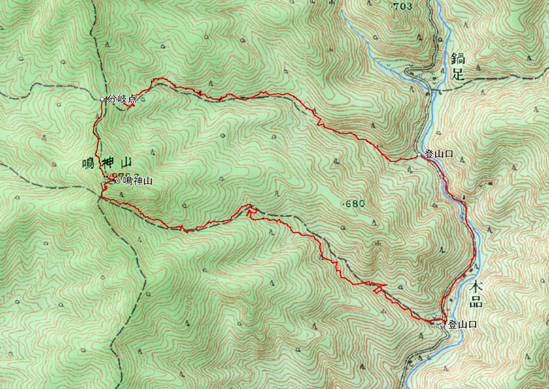下山コースは山頂から北に下り鞍部(左、駒方方面、右、鍋足方面コツナギ橋の標識あり)で右手に折れてカッコウソウ群生地を左手に見ながら植林帯を降って行く。降るにつれて涸沢が次第に小沢、渓流、小川となる頃コツナギ橋(鍋足))の車道に出て20分ほど車道を戻り木品の登山口に戻る。
