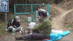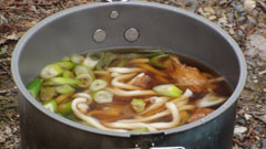 入山峠に戻り遅い昼食にする。昼食の内容は温かい、おでん、お赤飯、紅茶、うどんで体が温まり体力も回復する。山歩きした後の温かい食事は格別に美味しく3人で全て食べつくす。
