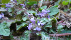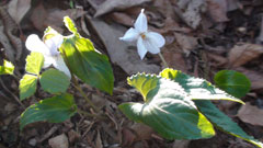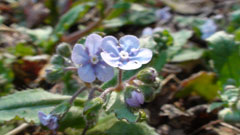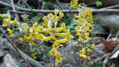林道を歩きながら多くの花が見られる スミレ、ニシギゴロモ、キケマンソウ、ムラサキケマンソウ、ヤマブキ、モミジイチゴ、ヤマザクラ、キブシ、ミミガタテナンショウ、ヤマルリソウ、ミヤマシキミ、ミヤマカタバミ、シロバナヘビイチゴ、エイザンスミレ等。