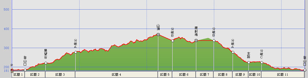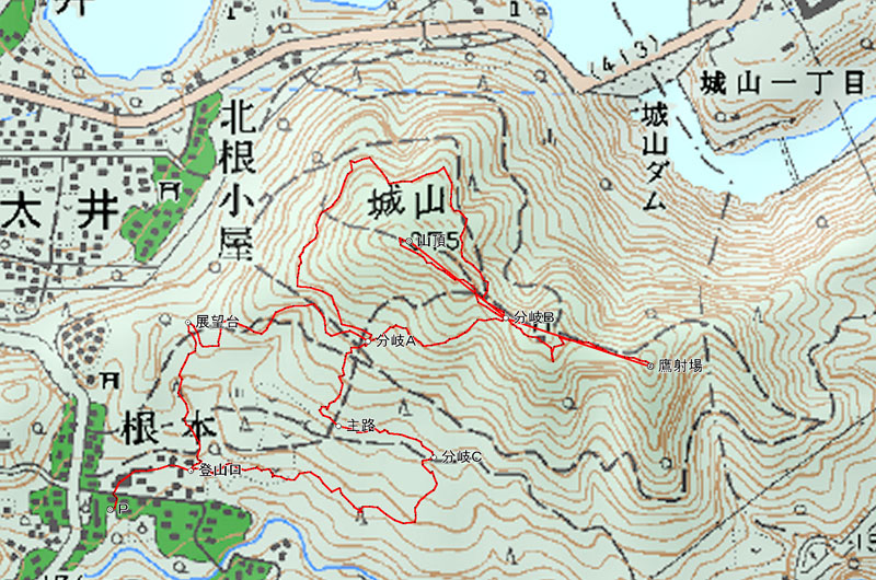 パークセンター8→展望台→尾根十字路→城山山頂→鷹射場→林道→尾根十字路→主道路→パークセンター