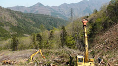 稜線上の分岐点、角研山で小休止ご黒野田林道までほぼ一直線に降る。ブナ林の中の登山道で足元もやわらかく明るい登山道で急斜面の割には降り易く感じる。最後は緩やかに降り勾配の林道を約1時間歩き変電所の所に戻る。