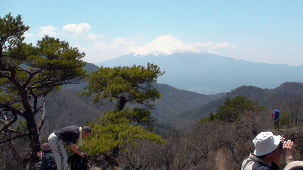 清八峠から清八山に登り。松ノ木越の富士山を眺めてくる。再び清八峠に戻り本社ヶ丸を目指す。天気も良くうららかな気分で稜線歩きを約50分本日の最高峰、標高1630mの本社ヶ丸山頂に到着。20人ほどの登山者で狭い山頂は賑わっている。此処で昼食と休憩。昨日メールで知らせてある武蔵野市のSAさんを無線で呼んでみたが今回は繋がらず交信出来なかった。