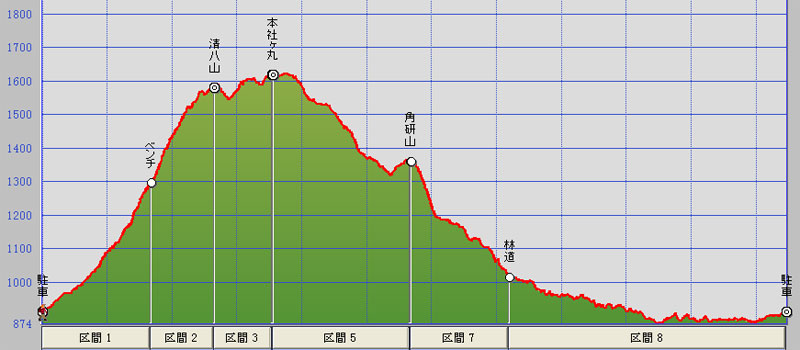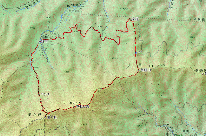 相模原6:30⇒八王子駅7:30⇒八王子IC8:20⇒大月IC9:20⇒変電所(駐車)9:35→ベンチ10:40清八峠11:15→清八山11:20〜11:38→本社ヶ丸12:12〜12:58→角研山13:50〜14:05→林道14:40→変電所(駐車)15:45⇒大月IC16:10⇒八王子IC17:10⇒八王子駅17:30⇒相模原18:30