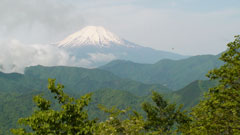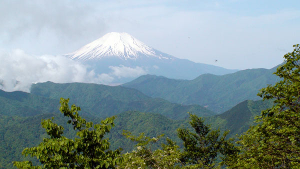 とりあえず加入道山を目指す明るい緩やかな広い登山道をゆっくりと歩き10分弱で加入道山山頂に出る。周りは新緑で展望が無く新緑の合間から富士山が見えるのだが残念だ。此処で檜洞丸の登山中のSAさんと無線交信。直ぐ隣の峰同士なので感度は良好で、この先バン木ノ頭まで交信できる。