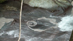 今日は此処から降ることにする。バン木ノ頭から約1時間の降りで野外活動センターの所に出る。車が入って来ているので車道を戻っても良いが沢に沿った道を30分ほど下り林道と合流する。林道を下る途中に的場様と言われている天然の川底に出来た的模様があり見て行く。野外活動センターから約1時間加入道山登山口の駐車場に戻る。