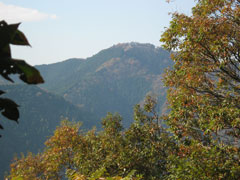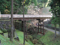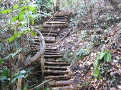 八王子城址方面に降ると直ぐに朽ちかけた木製の階段があり注意して降り後は沢に沿った登山道を20分ほど降ると林道となり10分ほどで御主殿跡の曳き橋の所に出る。御主殿跡の広場に登り曳き橋を渡り古道を通り管理事務所に戻ると往きにパンフレットを頂いた係りの人が居たので富士見台から富士山は見えなかった事や標識と朽ちた梯子の状況等を話してから駐車場に戻る。