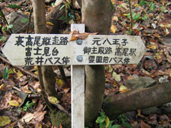 富士見台までは至る所に案内標識が設置されているので初心者でも安心して歩けるが富士見台から先は駒木野、荒井方面に下る案内のみとなる。富士見台直下の小下沢に降る登山道はハッキリと有るが標識が無し。富士見台から荒井、駒木野方面に30分ほど行った所で初めて八王子城址方面への分岐標識があり(左手に降る)一安心できる。