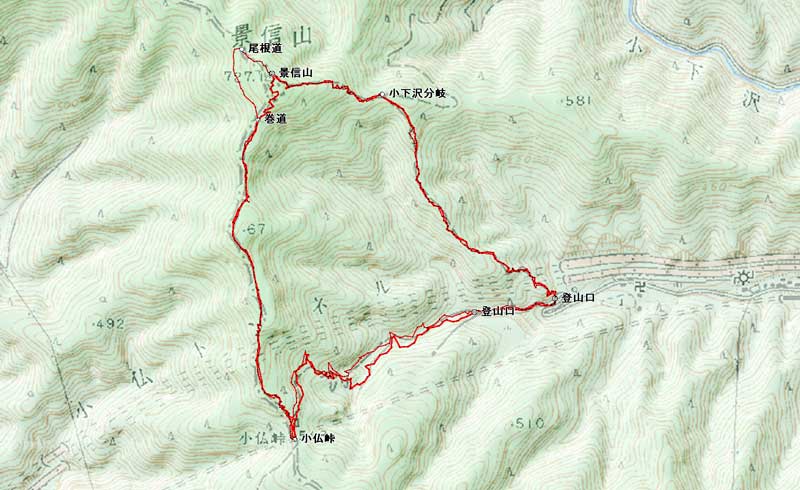 相模原7:20⇒小仏登山口8:20→小仏峠8:50→景信山9:40〜11:00→小下沢分岐11:17→景信登山口11:40→小仏登山口11:45⇒相模原12:30