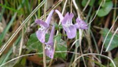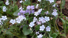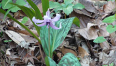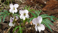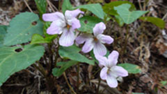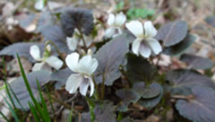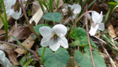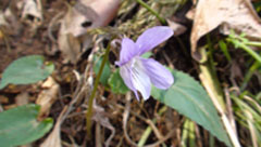 山の斜面には花の時期が過ぎたカタクリ、アズマイチゲの遅咲きが数株有り。イチリンソウ、ユリワサビなどは西山峠まで至る所で見られる。またスミレも数種類が至る所で咲いていて眼が落着かない。沢に沿って西山峠まで続く登山道の至る所で花が見られて尾根筋の道とは比べ物にならないほど花が多い。西山峠直下の日影のニリンソウは2部咲き程だが隣の山の斜面の日当たりの良いところは花が満開で群生している。
