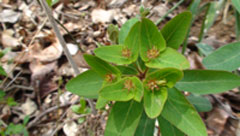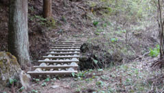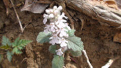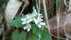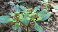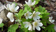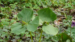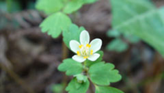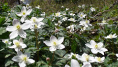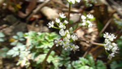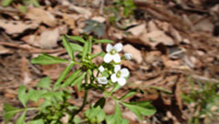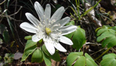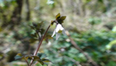 民家が見えてくると「うかい鳥山」の際を通過して往路の分岐点に出て車の停めてある山下バス停近くに戻る。不確実な情報だがヤマブキソウが尾根筋の道(泰光寺山近く)咲いている様なので梅ノ木平から三沢峠に向けて林道終点まで行き再び三沢峠を目指して山歩きをする。沢に沿った登山道なので此処でもニリンソウがいたるところで咲いている。トウゴクサバノオも見る事が出来る。30分ほど歩いて三沢峠に出る。