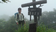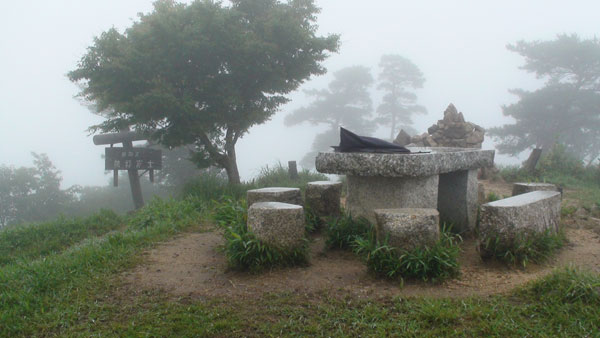 ほぼ平坦な尾根道を10分ほど行くと石のテーブルがある山頂に出るこんもりとした山頂には草原で樹木が無いので360度の展望があるが生憎今日は霧雨で煙っている。天気が良ければ後方に明日登山予定の御在所岳を仰ぐ事が出来る所だが残念だ。