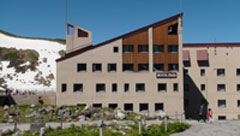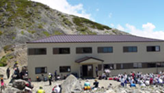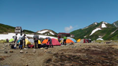 雷鳥沢を5分ほど登ると雪渓になり軽アイゼンとスパッツを付けて登る。雪渓は直ぐに終わりアイゼンを外して尾根筋の急斜面の苦しい登りが続く。前後に20人ほどの登山者も至る所で休憩しながらゆっくり登って行く。出発地の室堂が下方になり奥大日岳山頂2611mが真横に見えて来てガレ場の急斜面を登り切ると別山乗越2750m(剣御前小屋)に到着。学生の団体も休憩していて小屋前の広場は賑やかだ。