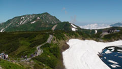 梅雨明けの3連休で混雑する事を避けて前日に松本まで行き早朝松本から立山を目指す。信濃大町からバスで扇沢に行き、トロリーバスでトンネルを抜けて黒四ダムに出ると目指す立山が対岸に大きく望める。ダムを歩いて渡り黒部湖駅からケーブルカーで黒部平に登りロープウェイで大観峰を経て再びトンネルをトロリーバスで抜けて室堂に9:15到着。