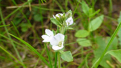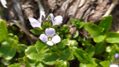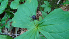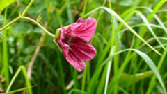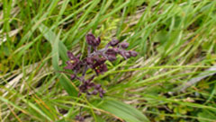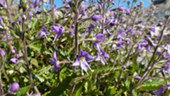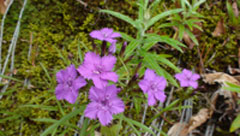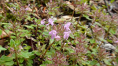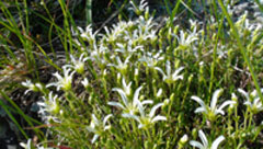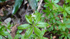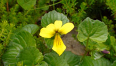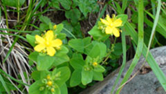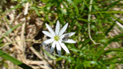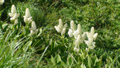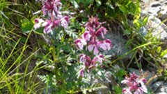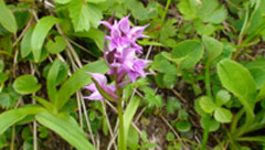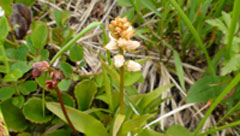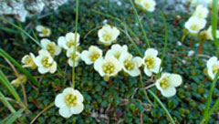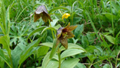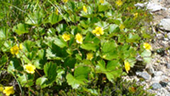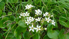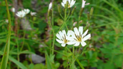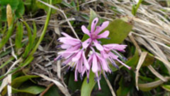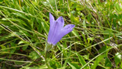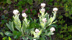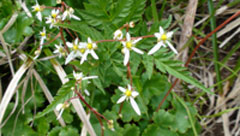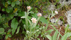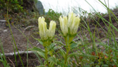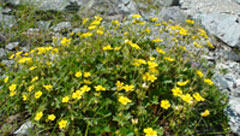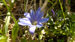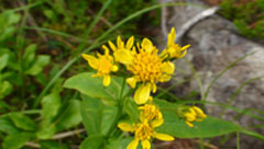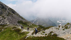 ザラ峠で再び休憩してから、本日最後の登り五色が原まで約40分の道程を行く。赤茶けた立山カルデラの縁を緩やかに登って行く。右側は切れ落ちた赤茶色の岩壁で火山の面影が残る。左側は緩やかなハイマツの茂る斜面で登山道の所何処でツマトリソウ、トウヤクリンドウ、ウサギギク等見られる。