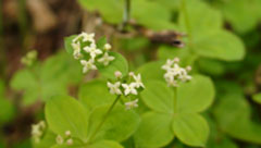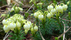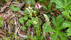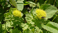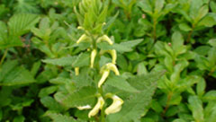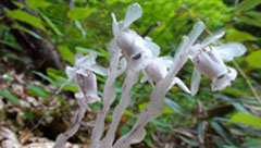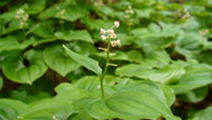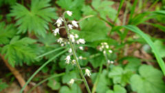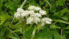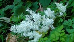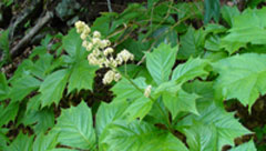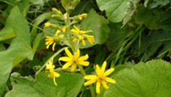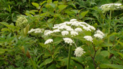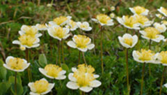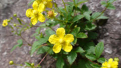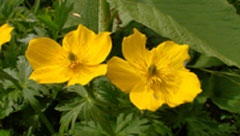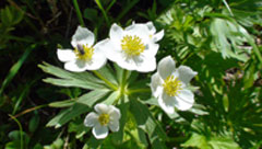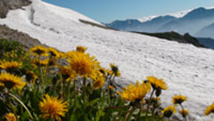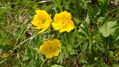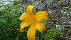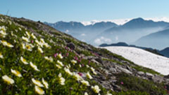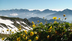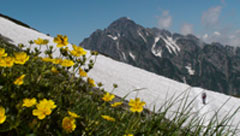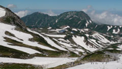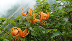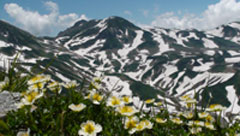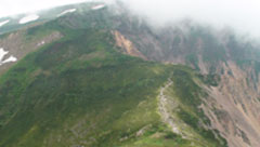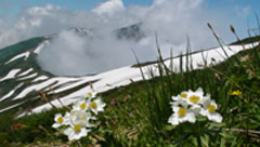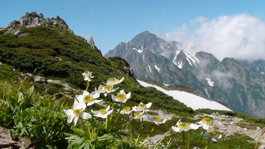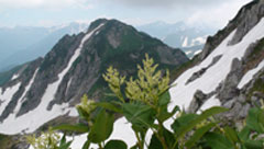 ハクサンイチゲ、シナノキンバイの白と黄色の花が鮮やかに咲いている鬼岳と獅子岳の鞍部を通過して獅子岳の登りとなる。振り返り見ると雄山の岩峰が時折ガスに覆われて見えなくなる。午後は水蒸気が発生しやすく展望も無くなるが直射日光が遮られるので暑さは凌げる。ショウジョウバカマ、コバイケイソウ、クロユリ、イワカガミ、ハクサンチドリ、チングルマ等、高度差と雪渓の影響で春から夏に咲く花を見ることが出来る。