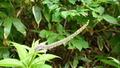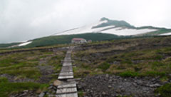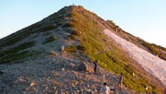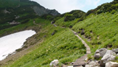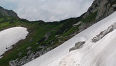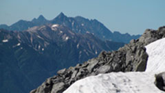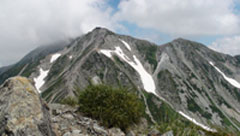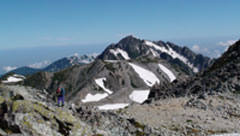 五色が原山荘までは未だ3時間ほどの距離があるので出発する。竜王岳の斜面を下り鬼岳に向う一帯は高山植物が多く見られて山歩きを楽しめる。雪渓のトラバースもアイゼン無しで難なく通過できて何度か小休止しては水分の補給をしながら鬼岳を越えて次の頂、獅子岳に向う。