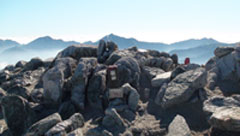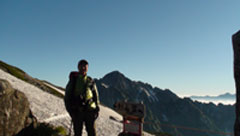 17日早朝、素早く朝食を作り済ませて、朝焼けの中を別山を目指す、振り返れば黒いピラミッド型の剣岳も次第に沢筋や雪渓等もハッキリ見えて来る。早朝は寒いのでウィンドブレーカーと手袋をして緩やかに続く別山の登山道を辿る。今日も天気が良く北アルプスの全容が見渡せる。立山は信仰の山が色濃く残っていて此処別山山頂にも小さな社がある。